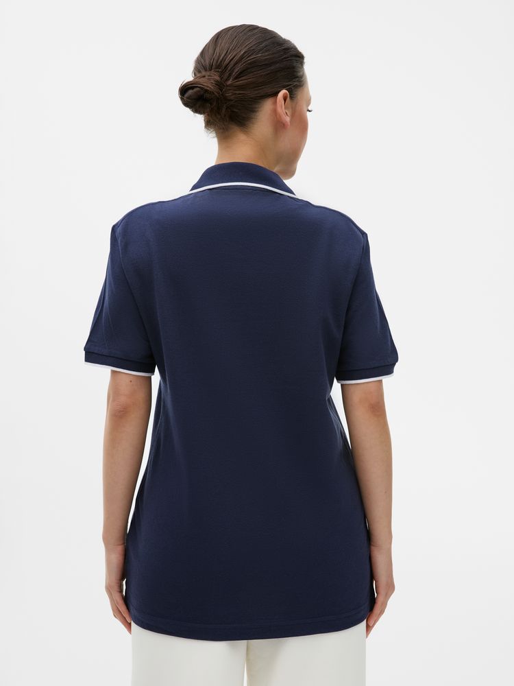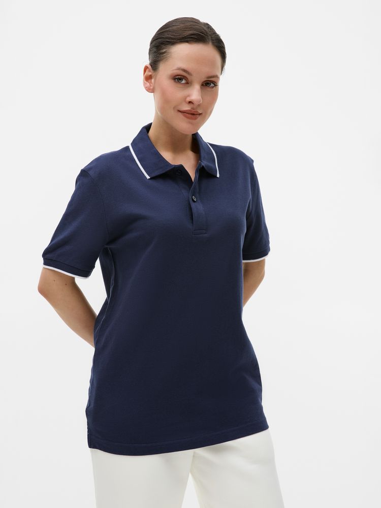 Рубашка поло средней плотности прямого кроя с контрастными деталями. Подойдет как мужчинам, так и женщинам.