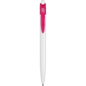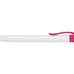 Стильная пластиковая ручка с ярким цветным клипом и белым корпусом отлично подойдет для нанесения логотипов и рекламной информации. Нажимной механизм.