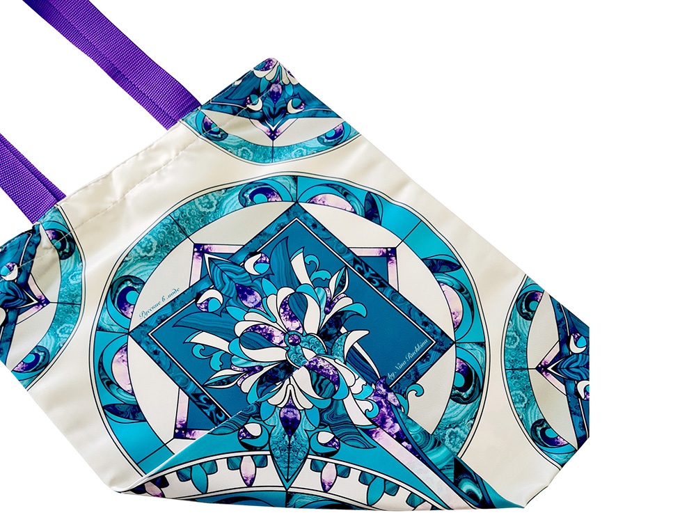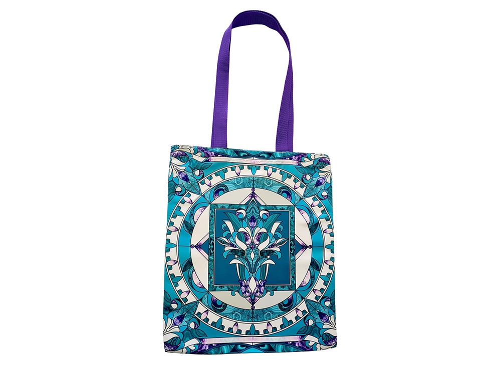 Представляем шоппер по мотивам платка «Каменный цветок»! Платок «Каменный цветок» раскрывает сокровищницу садов Хозяйки Медной горы, издревле воплощающей на Урале неисчерпаемый источник вдохновения. Заглавный образ платка навеян сказом о Каменном Цветке – символе творческого поиска и совершенства. Произведение относится к сборнику «Малахитовая шкатулка» регионального классика, уральского «гения места», писателя П.П. Бажова (1879-1950), который на основе фольклора создал вневременной эпос об Урале. По мотивам сказов, в дизайне платка мозаика цветка Хозяйки содержит уральские самоцветные кристаллы аметиста и медного изумруда, по преданию наделенного исключительной магической силой. Цветок предстает в обрамлении каймы узорчатого малахита – символа Хозяйки горы и Урала в целом.
