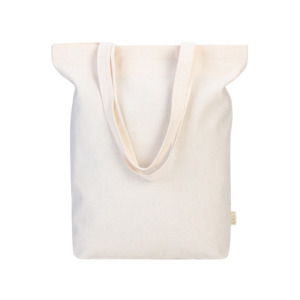 Удобная сумка-шоппер из переработанного хлопка. Можно хранить в сложенном виде и фиксировать с помощью эластичной ленты, застегивающейся на кнопку.