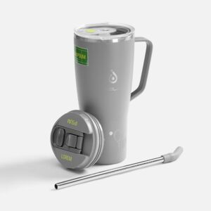 - 2 крышки в комплекте: одна на 100% герметичная с механизмом блокировки отверстия для питья, вторая — с отверстием для трубочки